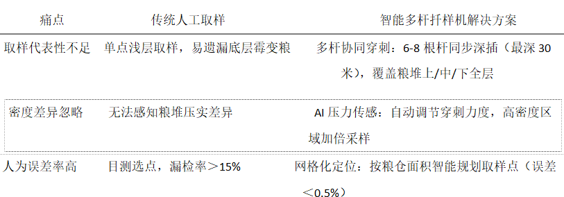 智能多桿扦樣機(jī),由多個(gè)扦樣桿組成,這可不是擺設(shè),多桿同時(shí)作業(yè),完成扦樣的速度杠杠的。提升檢測(cè)的準(zhǔn)確度,降低人工扦樣風(fēng)險(xiǎn),簡(jiǎn)化扦樣流程。在一些企業(yè)的實(shí)際應(yīng)用中,智能多桿扦樣機(jī)取樣檢測(cè)出的霉變粒,雜質(zhì)率比人取樣高21%,貼近真實(shí)質(zhì)量。